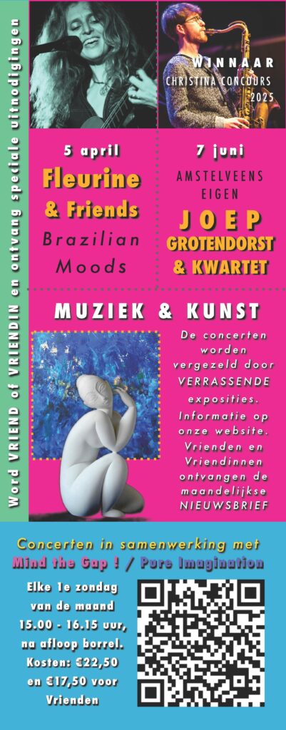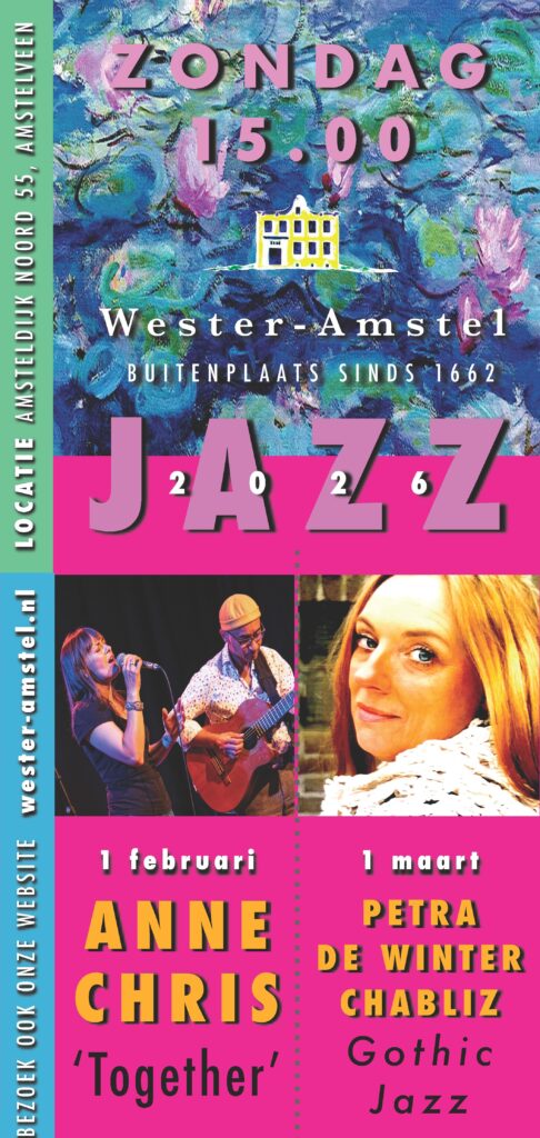 Het programma voor de komende maanden ziet er als volgt uit: in maart treedt Petra de Winter op, in april Fleurine. In mei hebben we in verband met de vakanties zoals gewoonlijk geen concert maar in juni speelt op de Amstellanddag Joep Grotendorst, winnaar van het Prinses Christina Jeugd Concours.